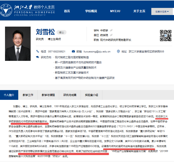 值得注意的是,关于刘雪松的履历,招股书与浙江大学网站披露的内容存在差异,如浙江大学网站显示,刘雪松是浙江大学现代中药研究所常务副所长,而招股书披露是副所长。