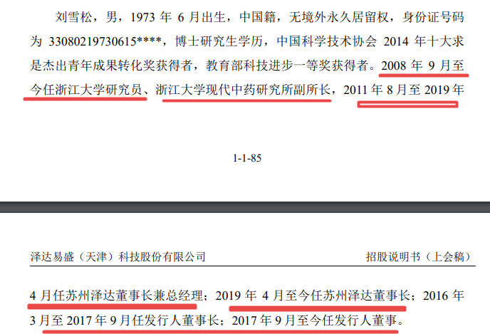 招股书显示,刘雪松任职浙江大学研究员、浙江大学现代中药研究所副所长,同时又担任过泽达易盛董事长、苏州泽达董事长和总经理,现任泽达易盛董事。刘雪松在泽达易盛的任职是否符合当时法律法规政策规定?招股说明书也没有披露。