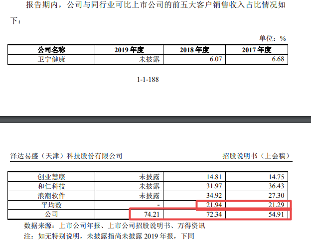 招股书披露,卫宁健康(300253.SZ)、创业慧康(300451.SZ)、和仁科技(300550.SZ)以及浪潮软件(600756.SH)四家上市公司前五大客户销售收入占比情况2017年和2018年度平均数是21.29%和21.94%,而泽达易盛则高达54.91%和72.34%,2019年度更是高达74.21%。